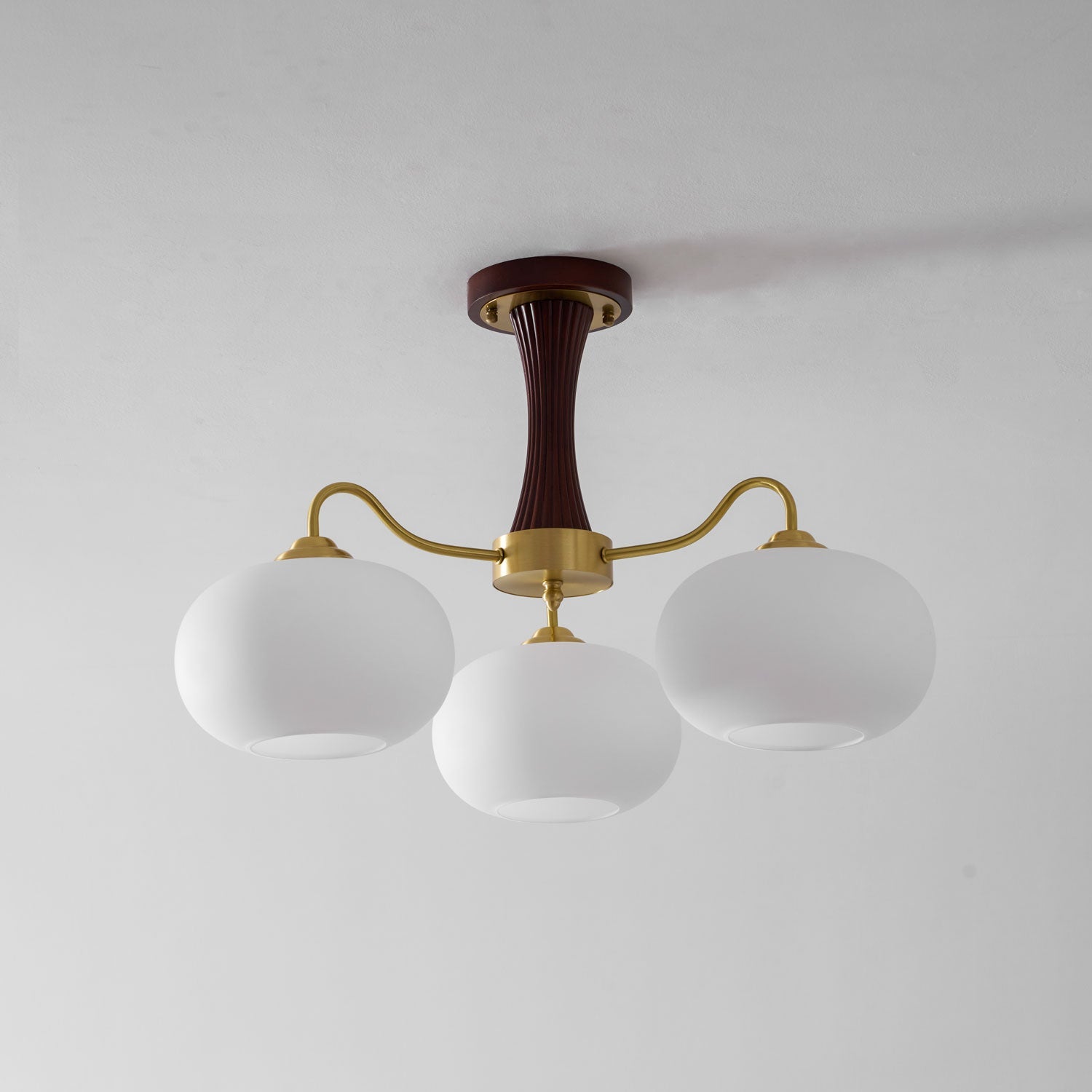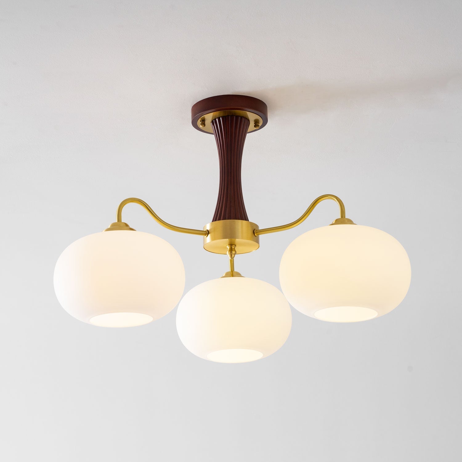 The Velmirae chandelier blends rich brass detailing with beautifully balanced wooden elements, creating a design that feels both romantic and refined. Inspired by the gentle form of persimmon fruit, Velmirae introduces softness and warmth into a space, while the white glass shades diffuse light into a calm, inviting glow that enhances living rooms, hallways and bedrooms alike. Crafted to bring depth and character to contemporary and classic interiors, Velmirae pairs natural wood tones with luminous brass for a look that feels effortlessly elevated. Whether suspended above a dining table or positioned as a statement in an entrance hall, Velmirae transforms everyday lighting into a moment of quiet luxury.